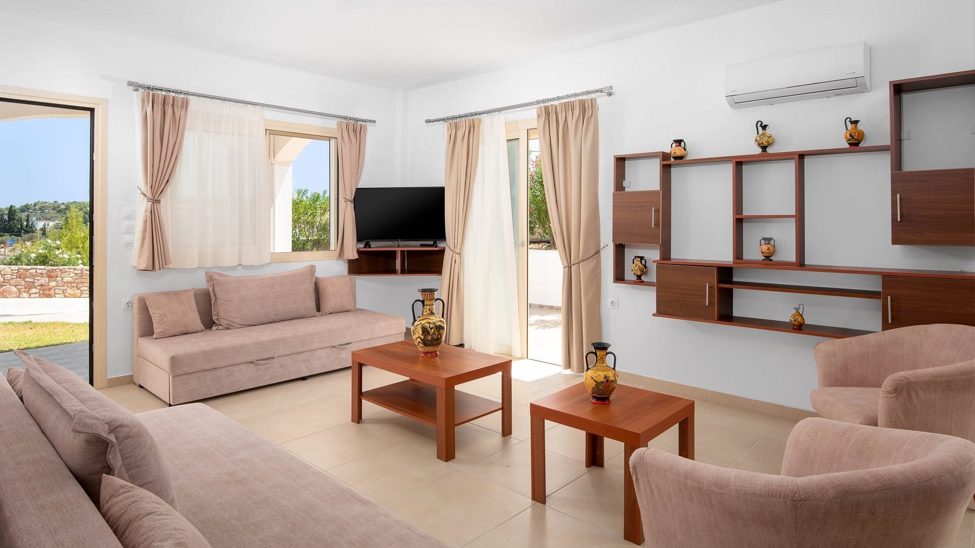 Each independent villa is decorated in earthy tones that are in perfect harmony with the local Dodecanese architectural tradition, selected decorative objects and state-of-the-art household appliances (refrigerator, oven, coffee maker, dishwasher, washing machine).